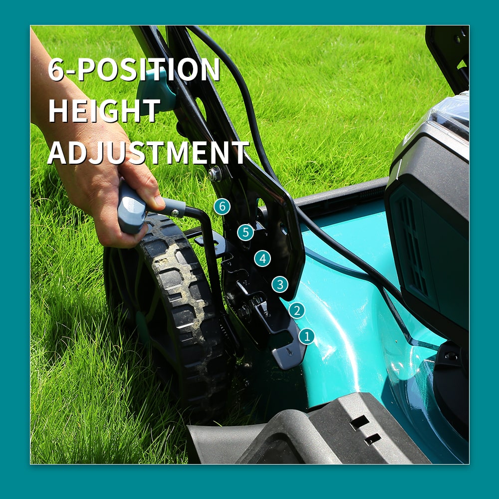Single lever 6-position height adjustment offers cutting height ranging from 1-1/8-Inch to 3-Inch and electric start
