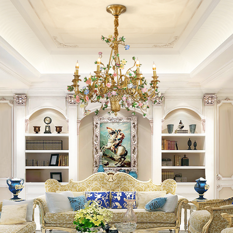 Zhongshan Factory European Style Brass Led Pendant Light With Porcelain Flowers Luxury Chandelier