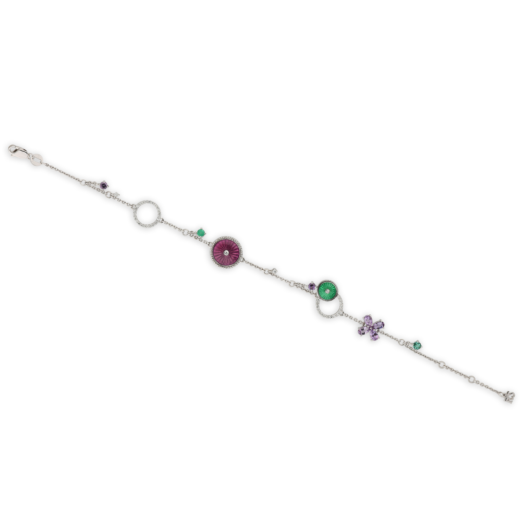 Experience the ultimate in luxury and sophistication with this exquisite white gold bracelet from RS Imperial Jewelry House. Featuring the lush green hues of emeralds, the rich purple tones of amethysts, the sparkling brilliance of diamonds, and the intricate artistry of guilloche enamel, this bracelet is a true masterpiece of design.