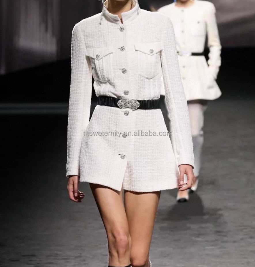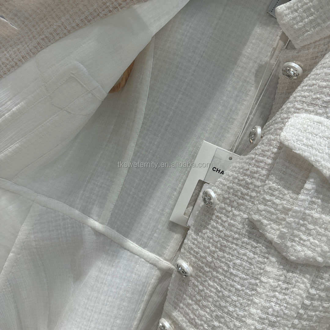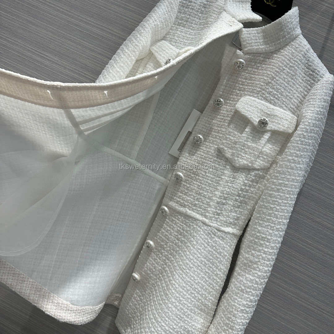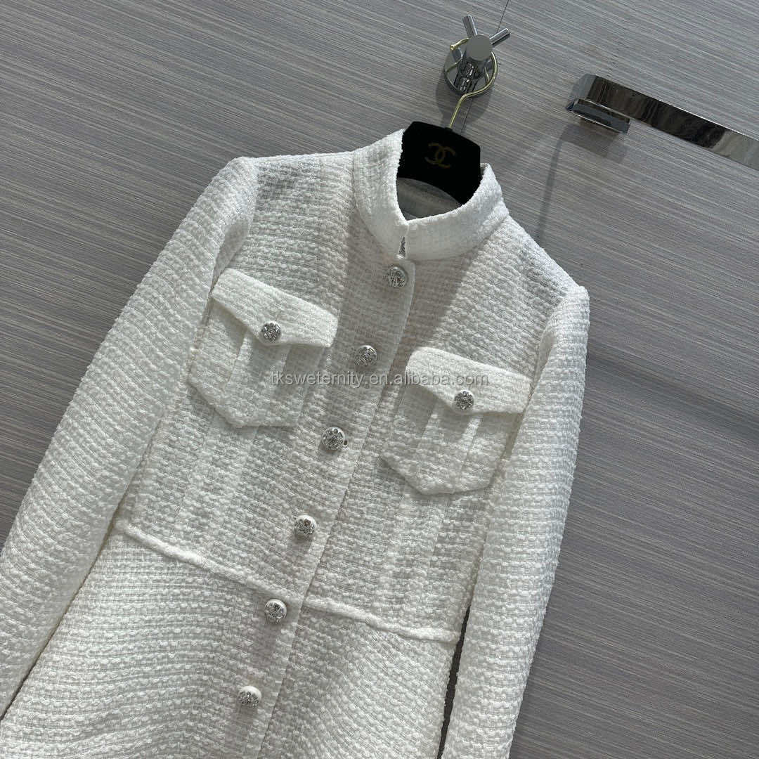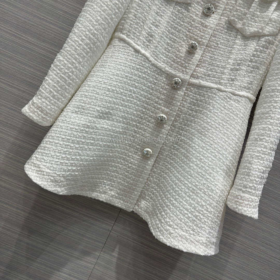 Top Quality Luxury Design with Logo Rhinestone Pearl Button 100% Real Silk Lining Knitted Jacket Girls Midi Tweed Blazer Dress