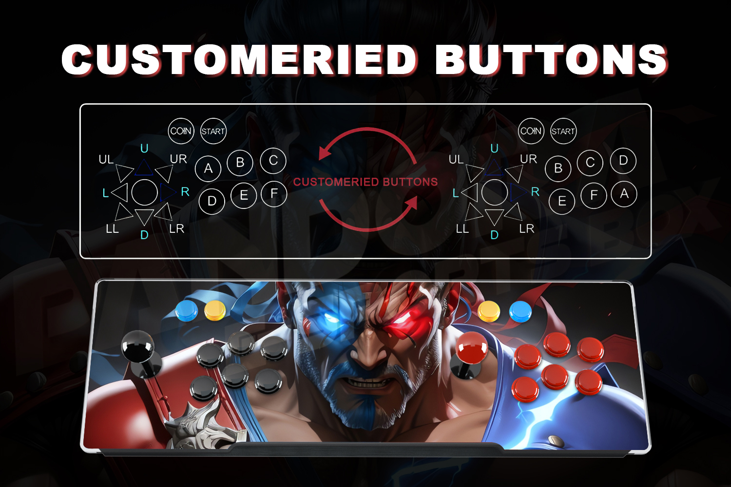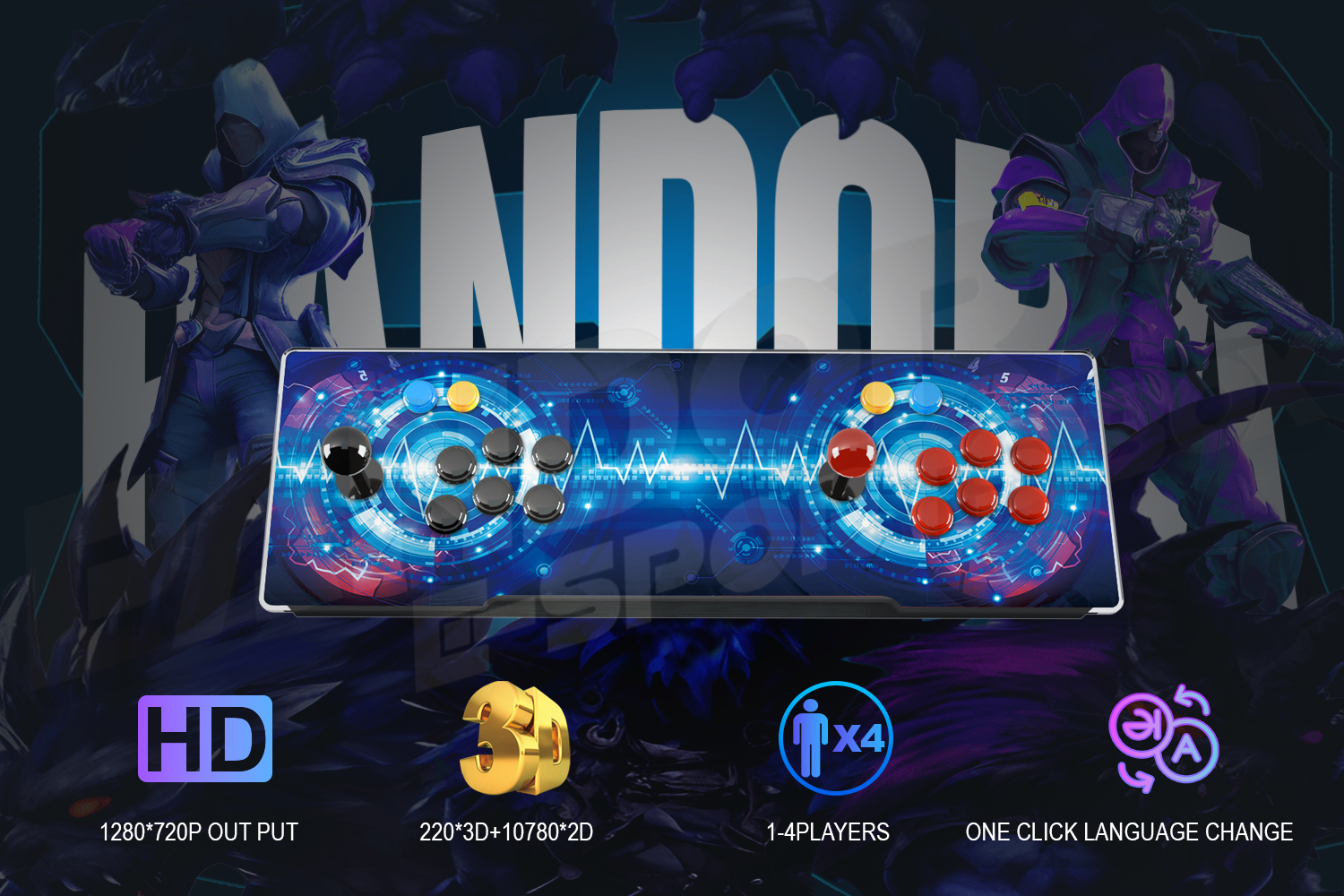 – Connection to any TV/Monitor via HDMI or VGA Cable (included) – High-quality joysticks & buttons for 1 or 2 Players –Fast loading times with OCTA-CORE GPU processor – Extensive menu with game previews – Coin-Op or Free Play Mode – Standard or High-Resolution output – Professional grid layout – Perfect arcade emulation Specification: Motherboard Configuration: Quad core CPU CPU: ARM Cortex A9 Quad core 1.8G GPU: Mali450MP8 DDR:4Gb EMMC: 32GB